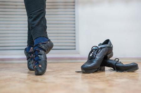 A photograph capturing tap shoes used in a tap dance lesson held within a dance studio.