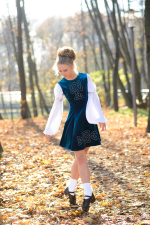 Irish dances. Professional dancer woman in national Irish costume makes a high jump during the dance. Studio full-length portrait.