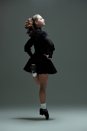 Traditional Irish dances. Professional dancer woman in national Irish costume makes a jump. Studio full-length portrait on a gray background. Culture.