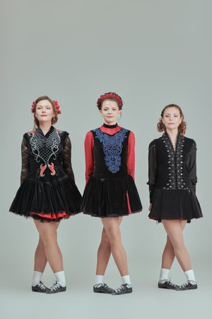 Irish ensemble of three beautiful women in concert costumes and Ghillies Hard Shoes dance together in a row. Full-length studio portrait on a grey background.