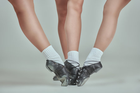 Close-up of Irish Dancers' legs in traditional Soft Shoes dancing together. Studio shot on a white background.