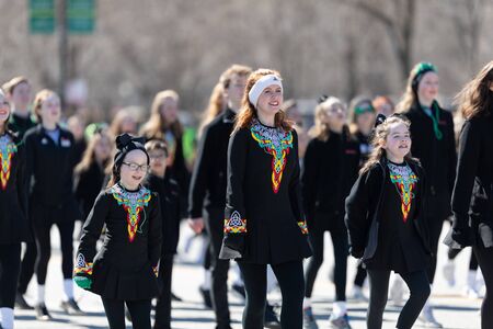 Chicago, Illinois, USA - March 16, 2019: St. Patrick's Day Parade, The Trinity Irish Dancers, dancing at the parade, going down Columbus Dr.