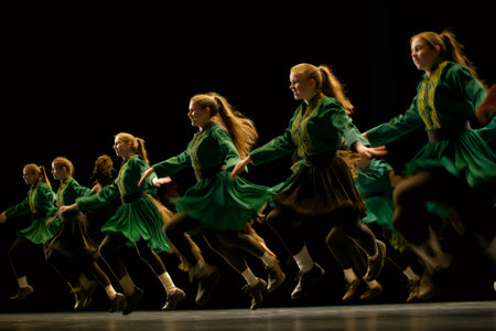 Group of female Irish dancers jumping together during a vibrant and energetic performance on a dark stage