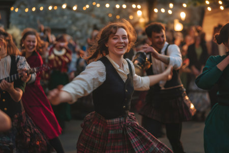 Lively Scottish ceilidh dance with musicians and dancers in traditional attire, celebrating Scottish culture at a vibrant evening festival