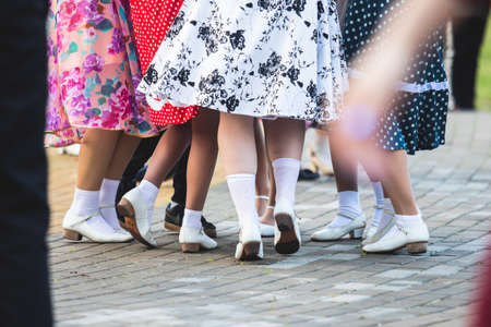 Young women wearing vintage polka dot dresses dancing in city park, close up view of same black dancing shoes and white socks, female retro jazz swing dances, a dance lessons