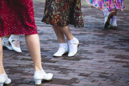 Close up of legs of young Romanian female dancers in traditional folkloric costume. Folklore of Romania