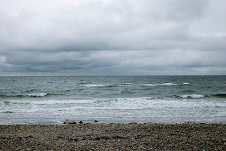 Baltic sea under dramatic sunset clouds after the storm. Waves, splashing water. Epic seascape. 40-50 knots wind force. Cyclone, gale, storm, rough weather, meteorology, ecology, climate change