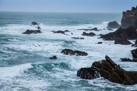 Cape Roca, Sintra, Portugal - June 3, 2018: view of the peaceful Atlantic Ocean with waves and under a cloudy blue sky