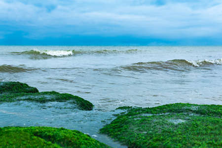 seascape, coast of the Caspian Sea with algae-covered coastal stones