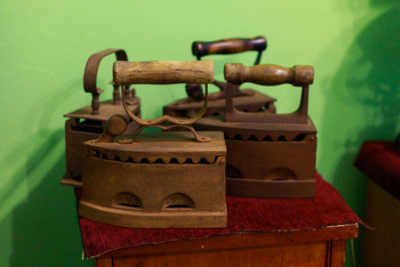 Antique charcoal irons. Vintage irons in row on wooden blue shelf.Old fashioned ironing tools.Heritage concept.
