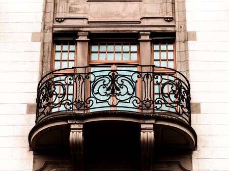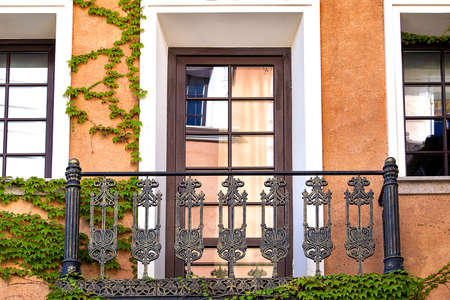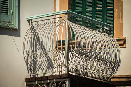 The wrought metal balcony of the house. Sunny autumn day. Front view.
