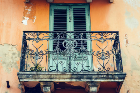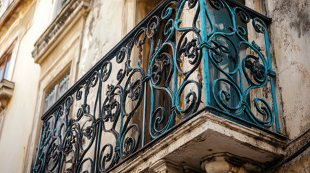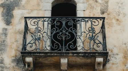 An ornate wrought iron balcony with floral patterns rests on the side of a weathered building, highlighting the charm of urban architecture. The muted colors contrast beautifully.