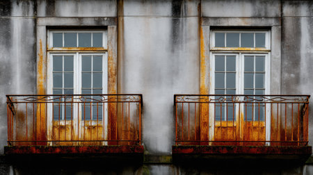 Two rusty balconies are attached to a weathered building facade, featuring peeling paint and aged windows that hint at a long history.