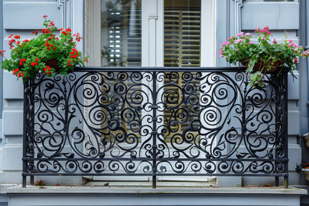This image showcases a beautifully crafted iron balcony featuring intricate floral designs, exuding elegance and architectural charm, ideal for enhancing any design project.