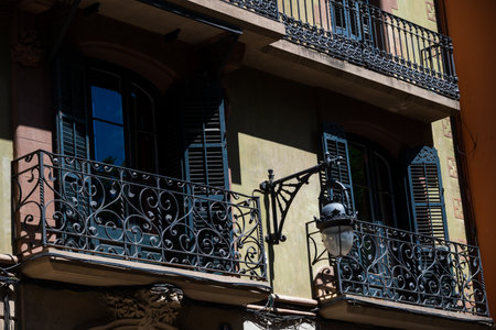 Barcelona, Spain - May 26 2022: Balconies in the Gothic Quarter.