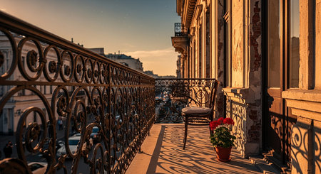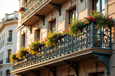 Elegant balconies with ornate railings and vibrant flowers in afternoon sunlight. That the image is generated using AI.