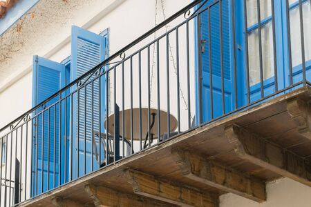 Athens Greece September 12, 2019 Closeup of a balcony on a facade of a house in the Plaka neighborhood in the afternoon