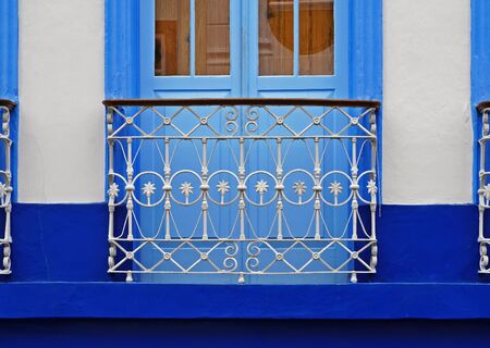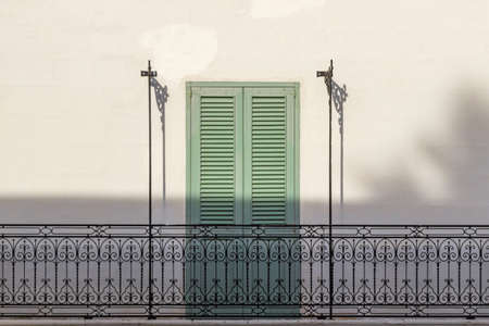 Typical balcony in Cuban Baroque style in Old Havana,Cuba. Wrought railings, door with wooden blinds