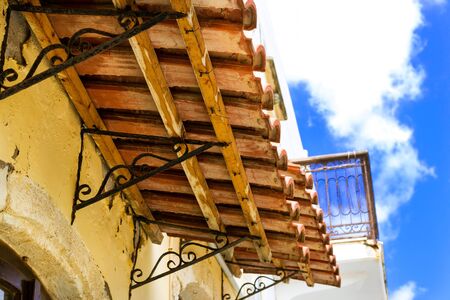 Tiled canopy over the window. Resort classic Greek architecture in port city Rethymno. Crete, Greece