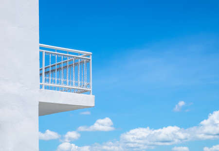 A modern balcony with a sleek railing juts out into the bright blue sky. White clouds gently float in the background highlighting the architectural design and open space that invites serenity.