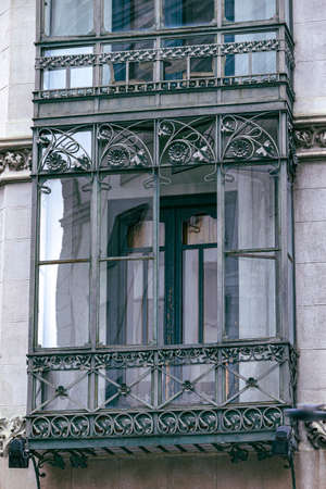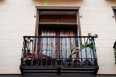 Low angle view of old cast iron balconies of old residential building in Lavapies quarter in Madrid