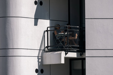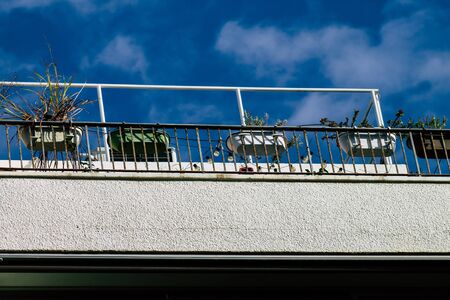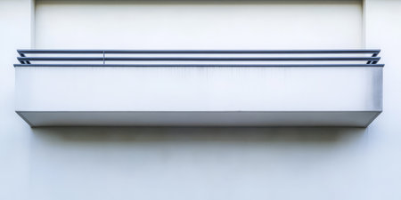 A balcony with a minimalist design is attached to a modern building. Its clean lines and light colors create a contemporary aesthetic. This structure enhances the urban environment.