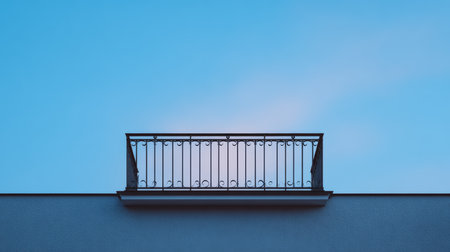 A clean balcony railing sits atop a building, framed by a tranquil blue sky at twilight. The scene evokes calm and simplicity, highlighting architectural design.