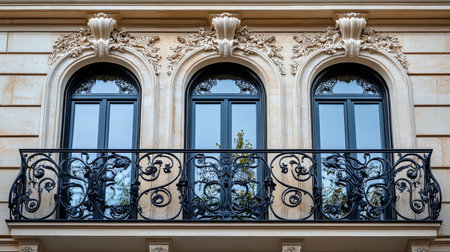 Elegant black iron balcony featuring intricate decorative details, lush greenery, and large windows in an urban setting, showcasing timeless architectural beauty.