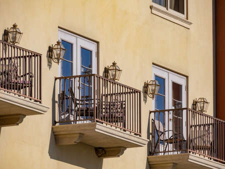 A facade of an old apartment building with contrasting shadows of an open balcony. Urban European architecture of Spain, Madrid. Yellow beige house with balconies. House facades in summer midday.