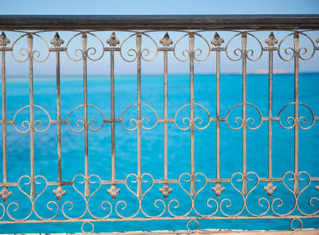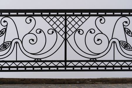 Black metal fence, close up. Beautiful decorative cast iron wrought fence with artistic forging. Metal guardrail