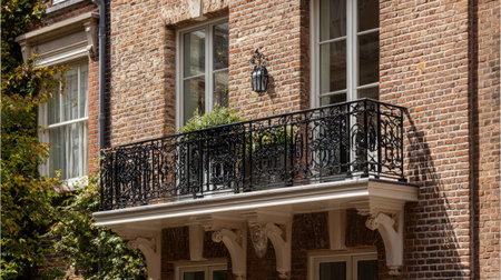 This image features a beautifully crafted wrought iron balcony adorned with greenery, nestled against a classic brick building. The sunlight highlights the architectural details, creating a charming urban scene.