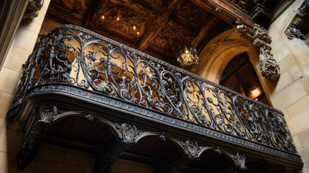 Discover the elegance of this ornate iron balcony featuring intricate designs and rich woodwork, set in a luxurious, historical interior environment.