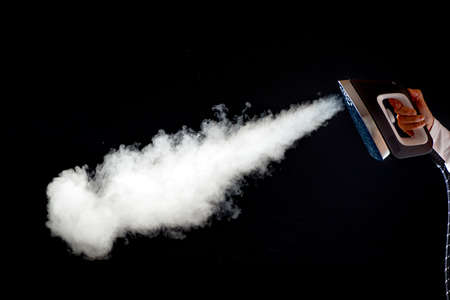 An iron with a steam generator sprays white hot steam on a black background. Steaming clothes, ironing.