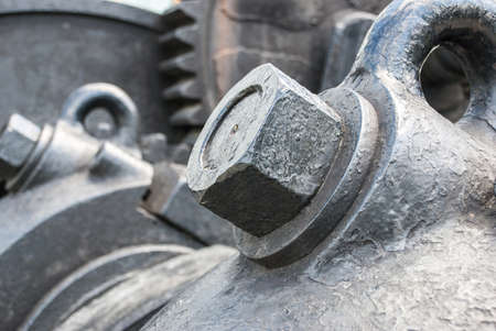 Industrial details, mechanical objects and tools concept. Screws, bolts on steel big machinery closeup