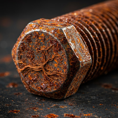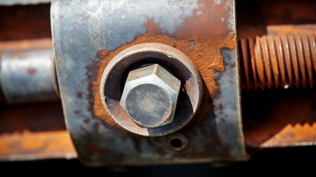 Metal bolt and nut assembly securely fastens components of heavy machinery in an outdoor industrial setting under natural lighting.