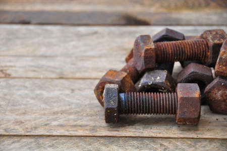 Old bolts or dirty bolts on wooden background, Machine equipment in industry work.
