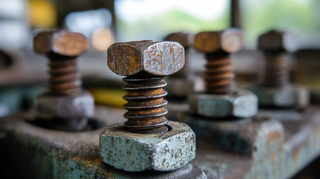 two rows of large bolts and nuts, integral for securing bridge metal structures, symbolizing strength, durability, and engineering precision.