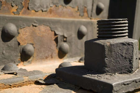 Old rusty large metal nut and bolt holding two rusty metal plates together