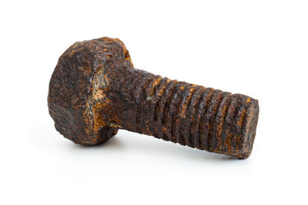 Rusty metal bolt. Mechanical component worn out by time and covered in rust isolated on white background.
