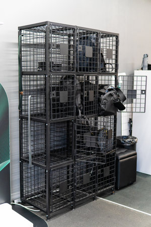 a photo of a cage of cages in an isolated warehouse, featuring minimalistic canine sculptures. the meticulous photorealistic still lifes, inspired by agnes martin, capture the chrome-plated, photorealistic urban scenes. the soft light adds to the urban grittiness of the composition. ai generated