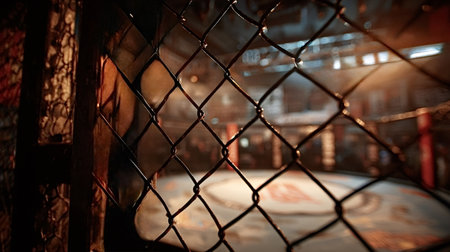 Blurred fighting arena is viewed through steel cage mesh suggesting themes of combat sports, competition, and the controlled violence of mixed martial arts