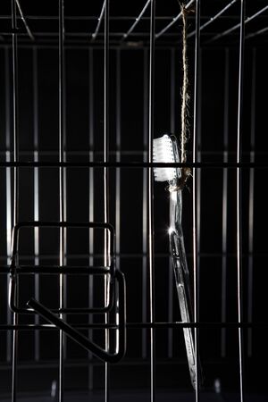 hand trying to hold a sugar jar inside a locked cage, concept of anxiety, temptation, weight loss, sugar-free diet vertical
