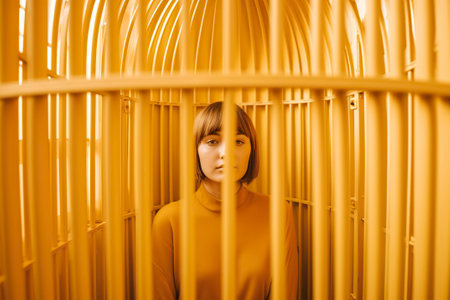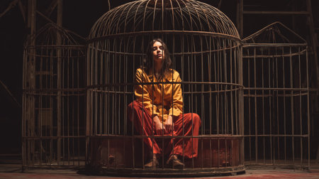 photo beautiful girl sitting in a large cage .Generative AI