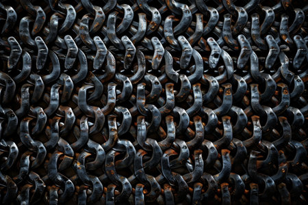 This close-up image captures the intricate details of a robust steel chain link showcasing its strength and durability. Ideal for industrial themes.