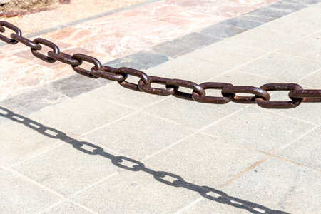 Rusty brown chain casting a sharp shadow on sunlit paving stones