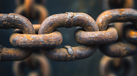 Close-up view of a rusty metal chain, showcasing intricate textures and patterns. The blurred background enhances the industrial aesthetic, evoking strength and durability.