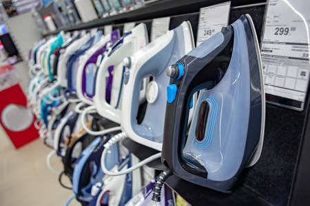 Maikop, Republic of Adygea, Russia - a selection of irons on a trade showcase in an electrical store, irons of various brands on the shelves of a specialized store in a linear perspective