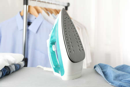 An iron and a blue men's shirt on the ironing board. Minimal concept of linen care.