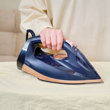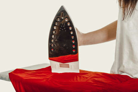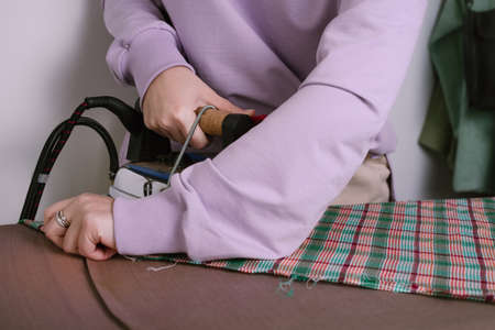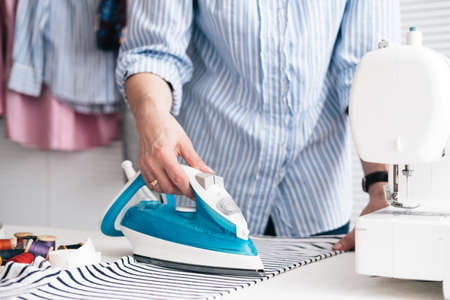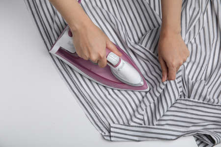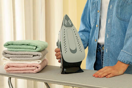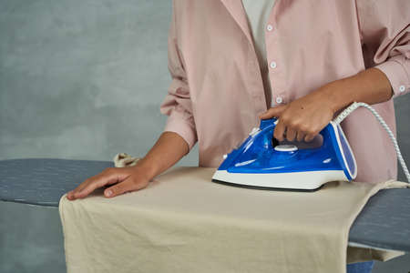 No wrinkled clothing. Close up of woman ironing clothes on ironing board at home