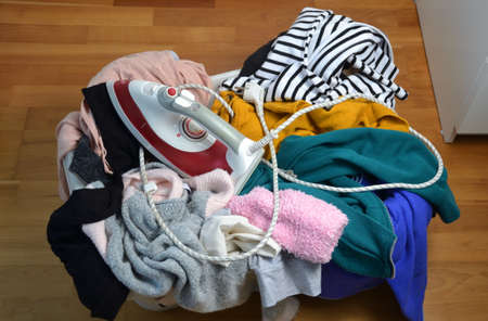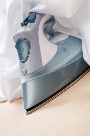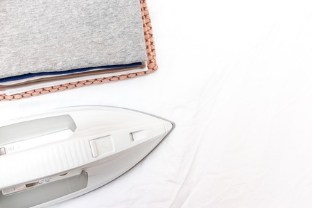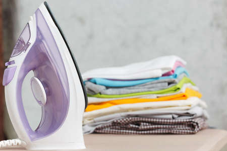 Modern electrical white iron on a stack of clothes close up - ironing, laundry and housework concept.